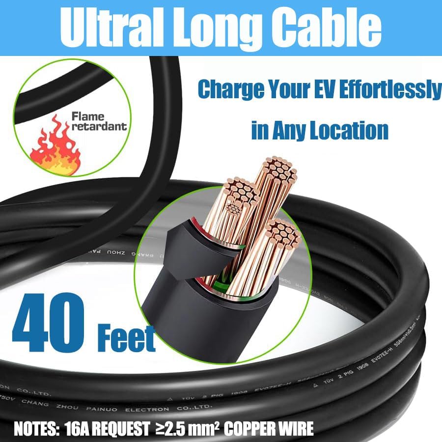 - 【Faster Charging at 240V】: Our electric car charger features a maximum charging current of 16A and support for a voltage range of 110V-240V. By plugging into a 240V socket, you can double the charging speed and get back on the road in no time.