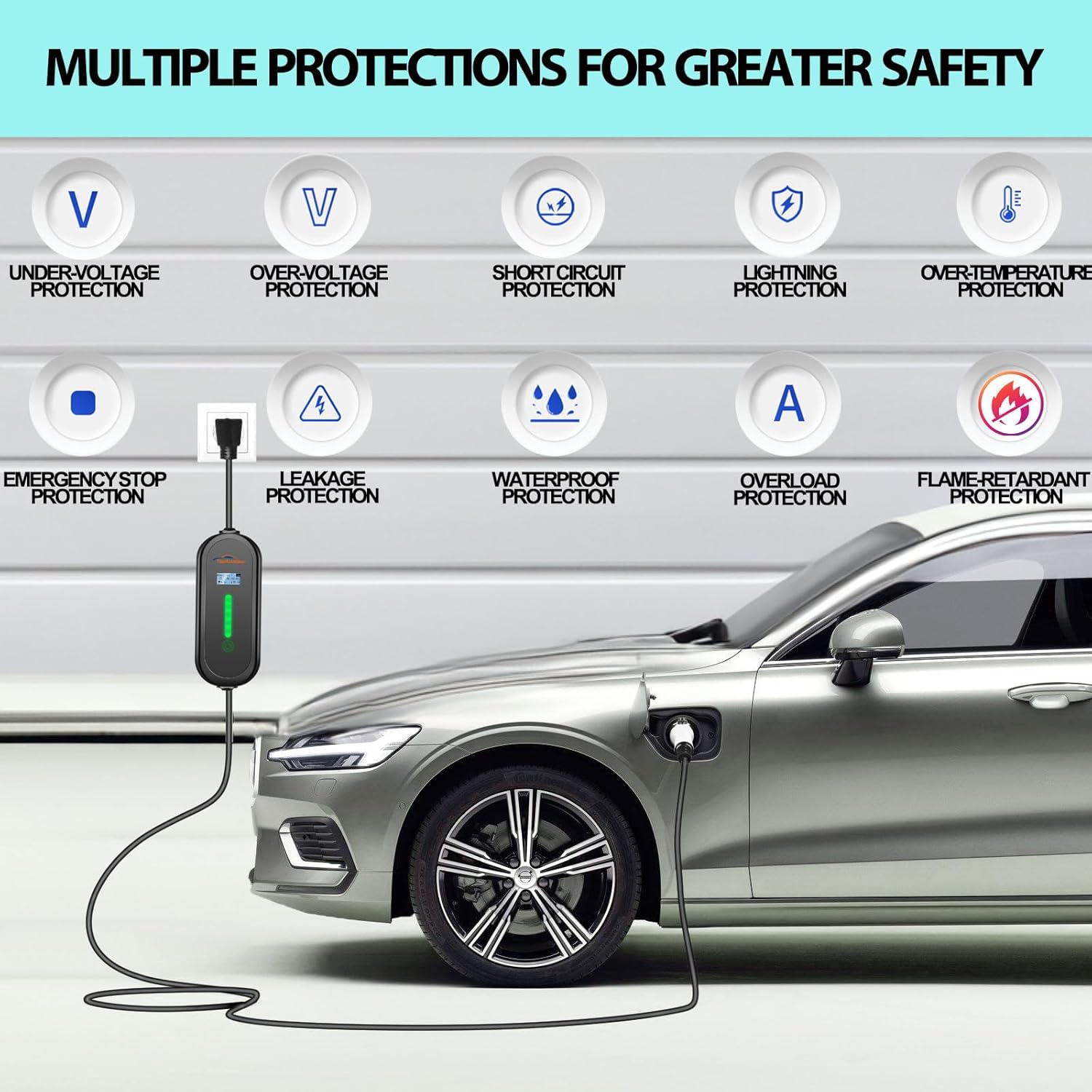 - 【Safety Guarantee】: Our electric car charger comes with multiple protections, including lightning protection, leakage protection, grounding protection, low voltage protection, overvoltage protection, overcharge protection, overheating protection, and overcurrent protection, ensuring safety and reliability.