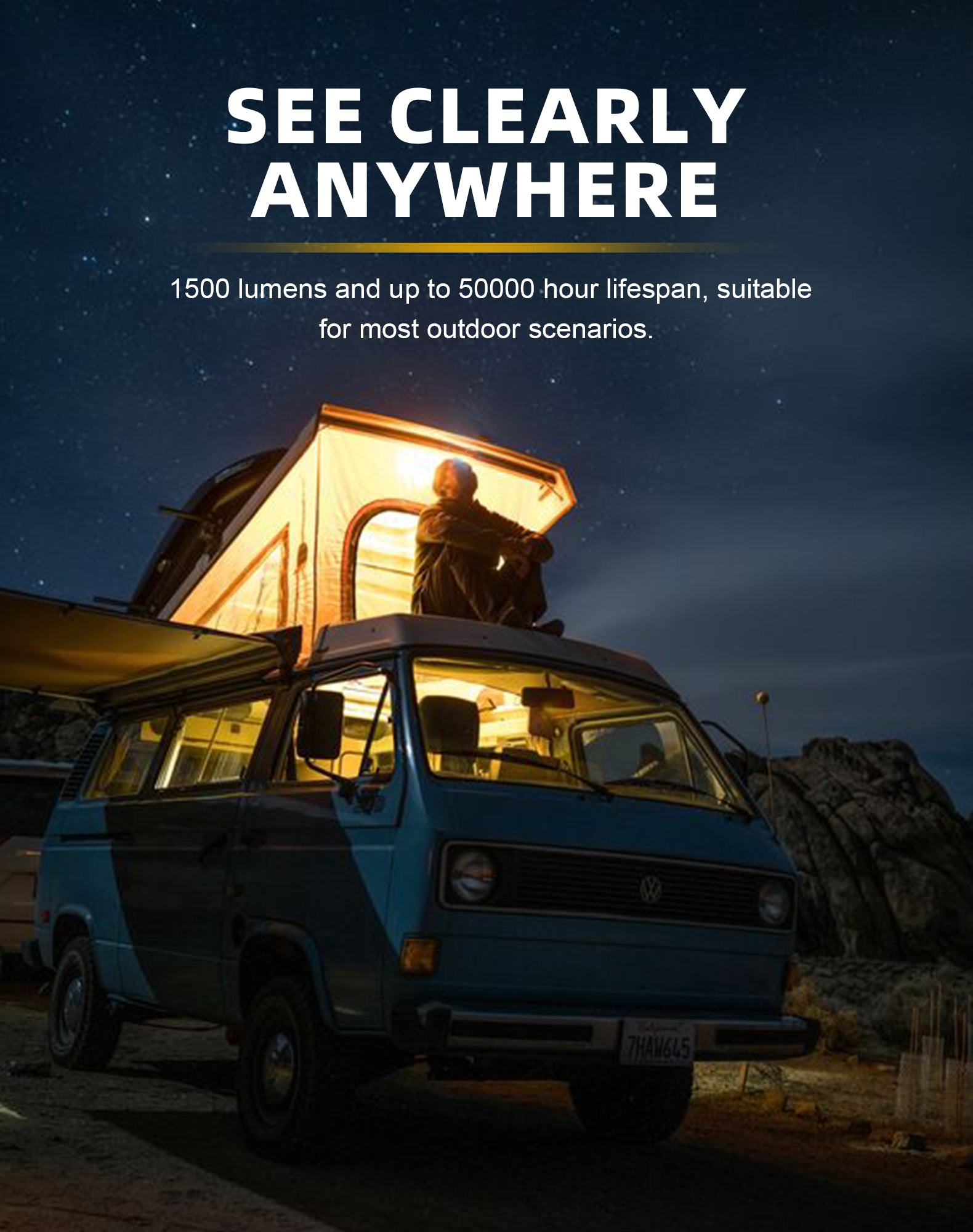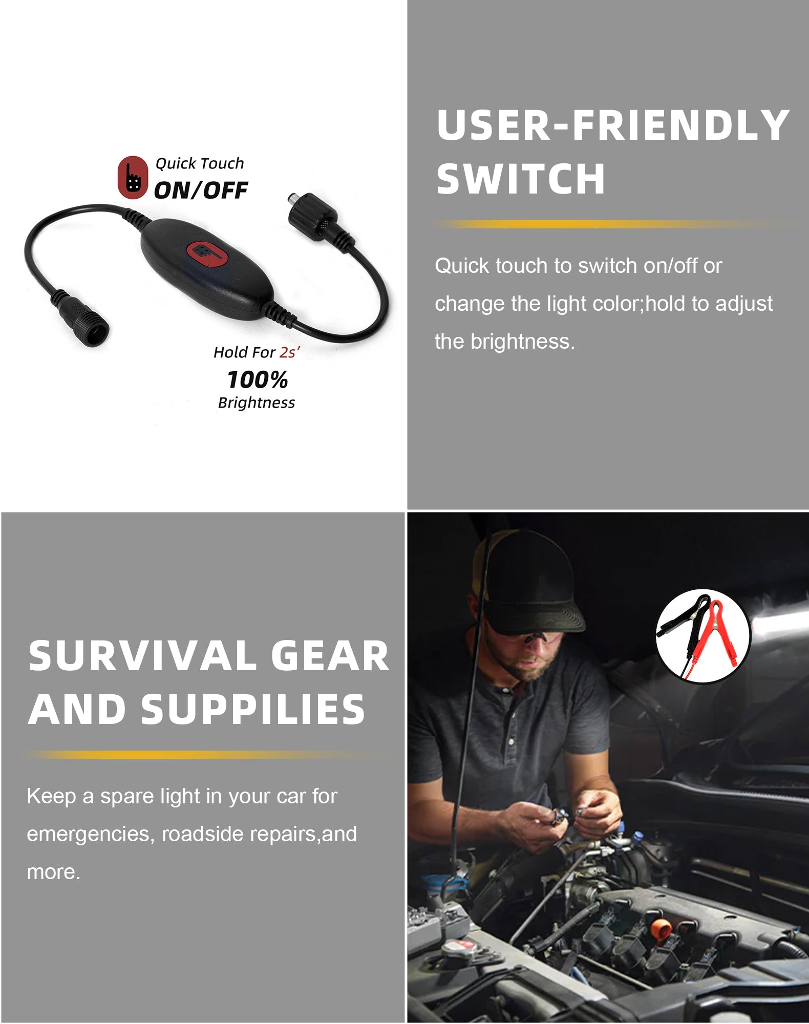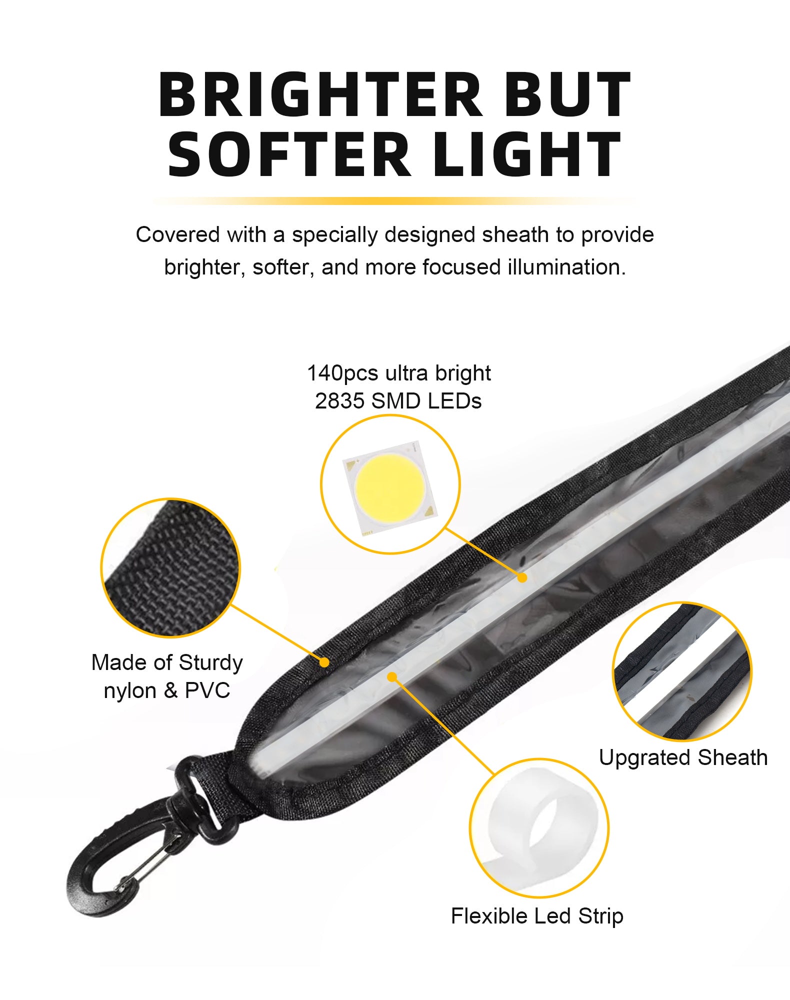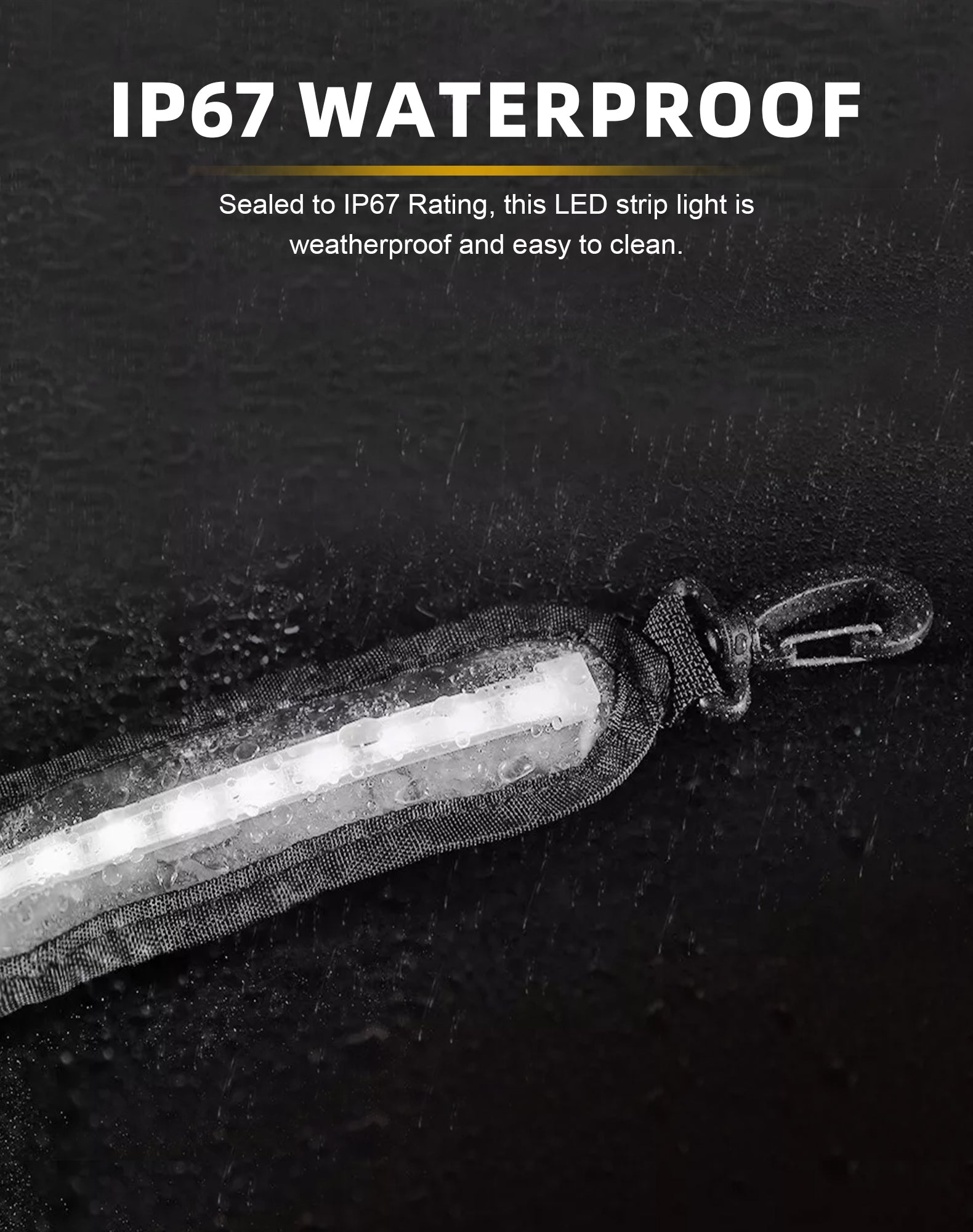 - 【Longer LED Life Span】Built with an IP67 waterproof sheath and connectors, our 12v led light strip ensures reliable performance in all weather conditions. Encased in a durable nylon and PVC bag, this camping light offers extra durability while maintaining a sleek and portable design.