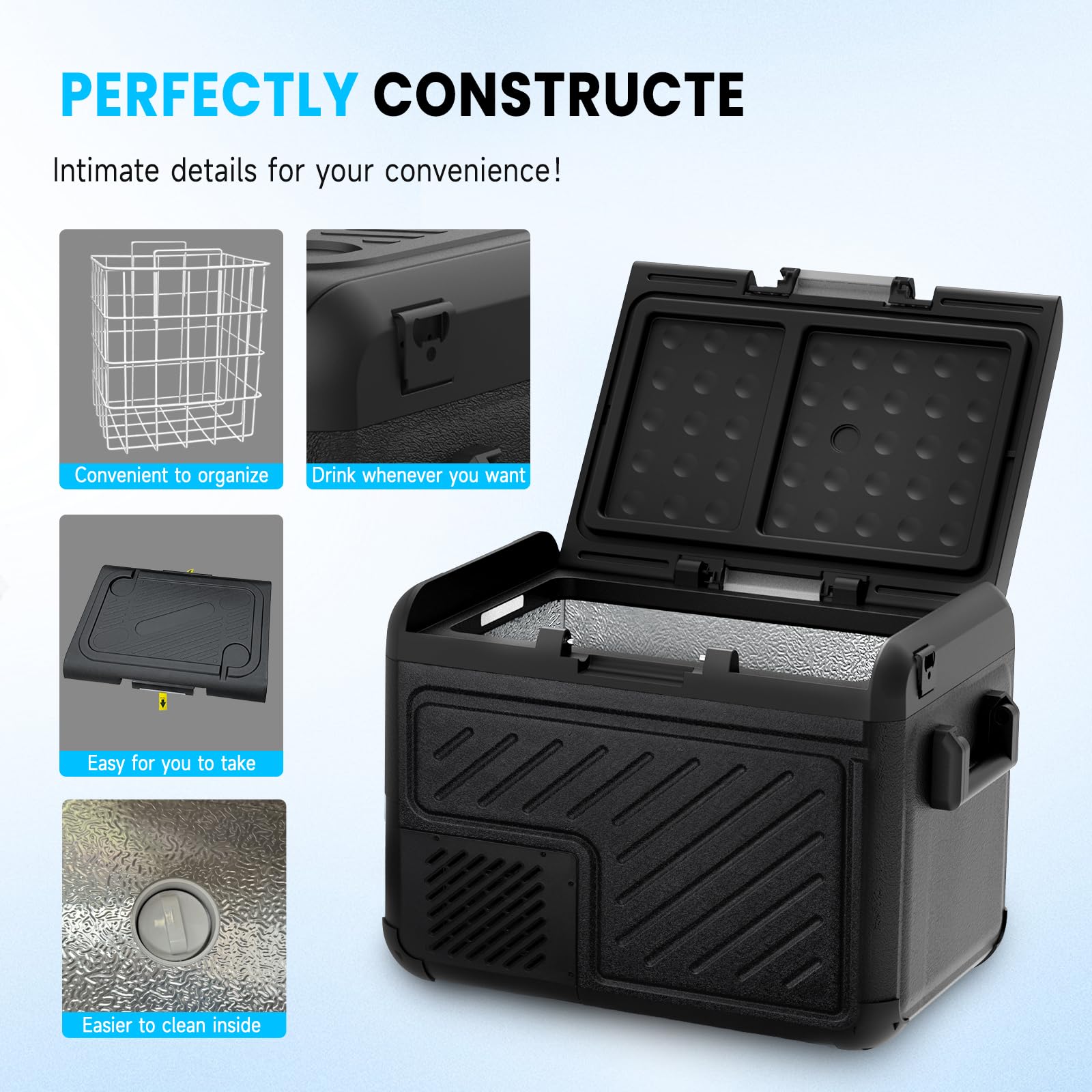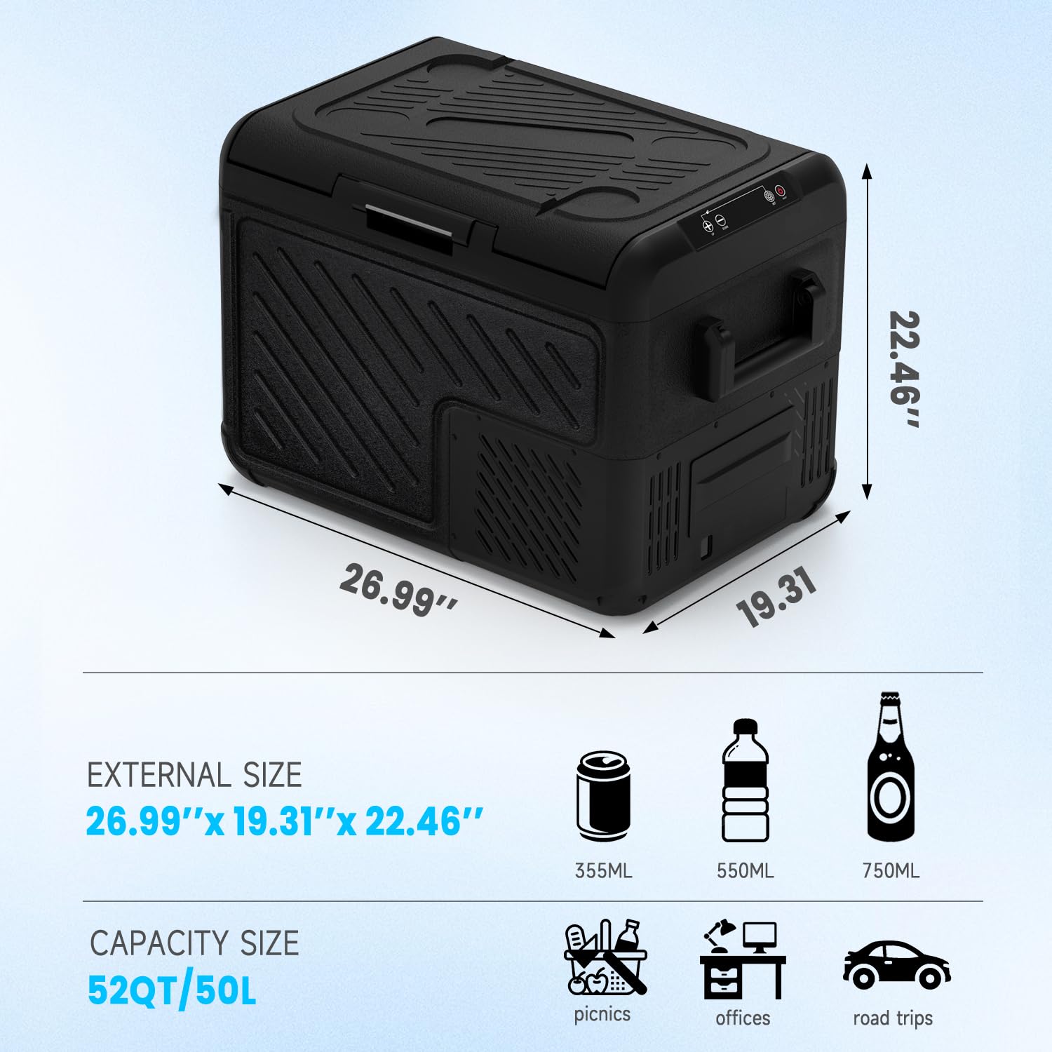 - Fast Cooling: This 12V car refrigerator has a built-in high-efficiency compressor,it produces a quick cooling effect and guarantees a temperature of -8℉~68℉(-22℃~20℃), 52Qt capacity suit your various needs providing you with ice-cold drinks and snack.