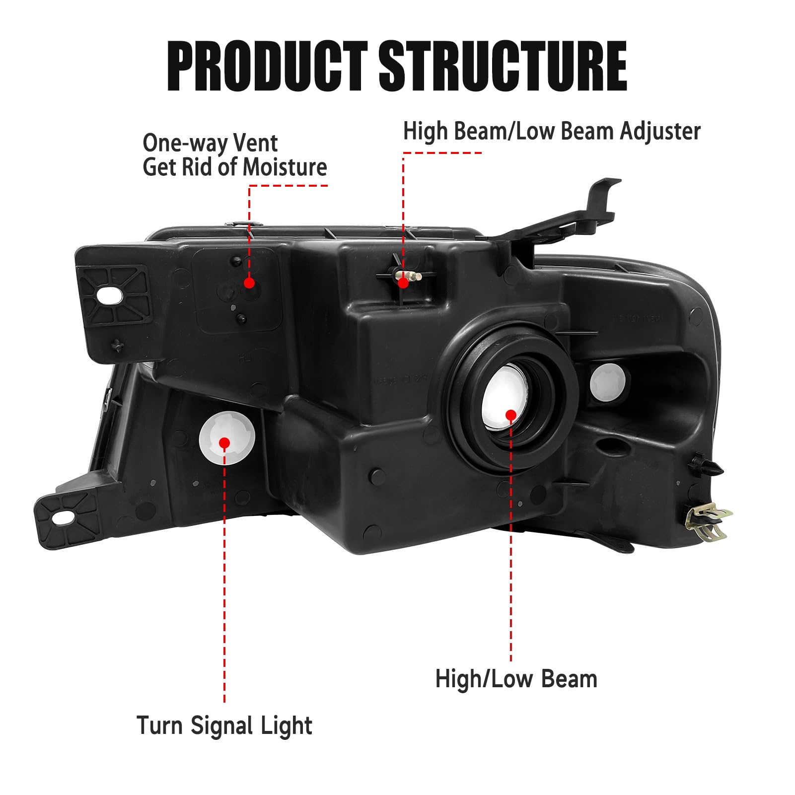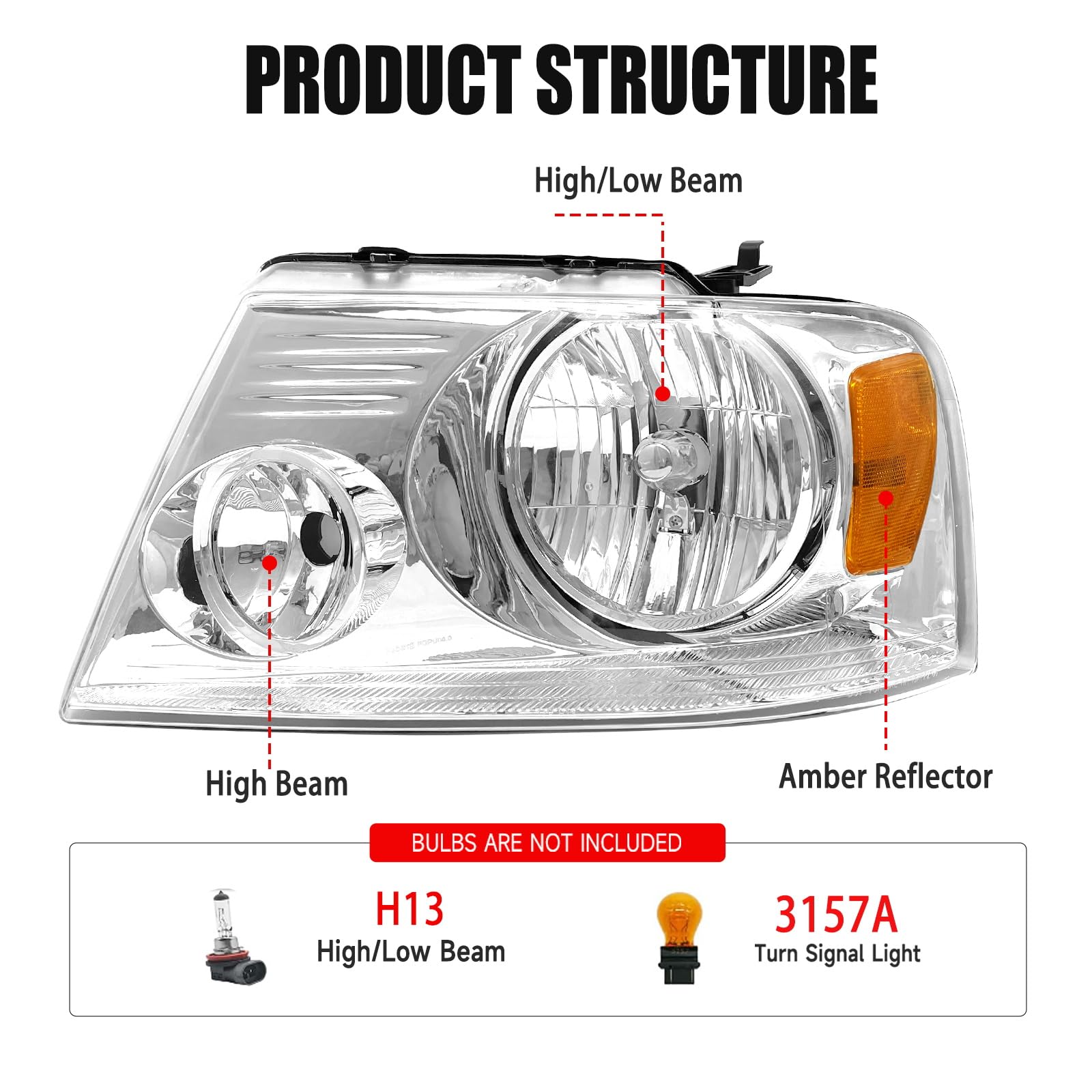 - 【VEHICLE COMPATIBILITY】Headlights assembly compatible with OE Type 2004 2005 2006 2007 2008 Ford F150/2006 2007 2008 Lincoln Mark LT.High/Low Beam:H13 Bulb,Turn Signal Beam:3157A.No bulbs included