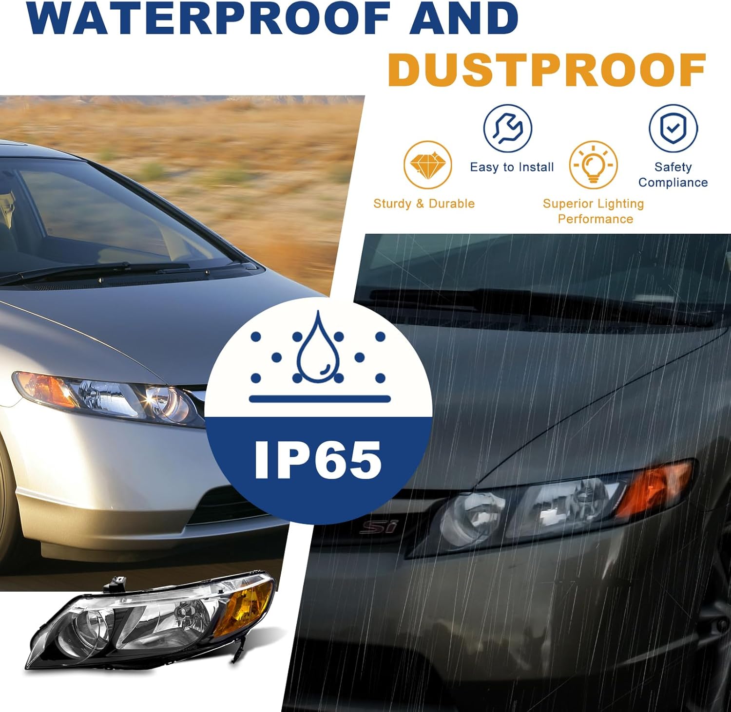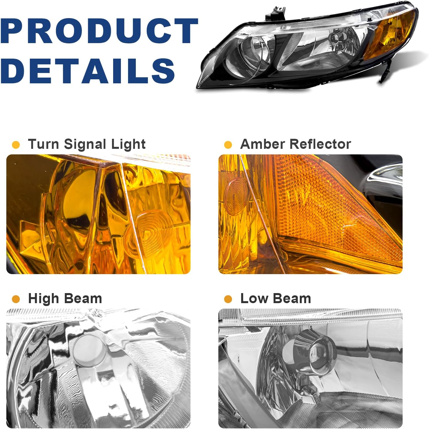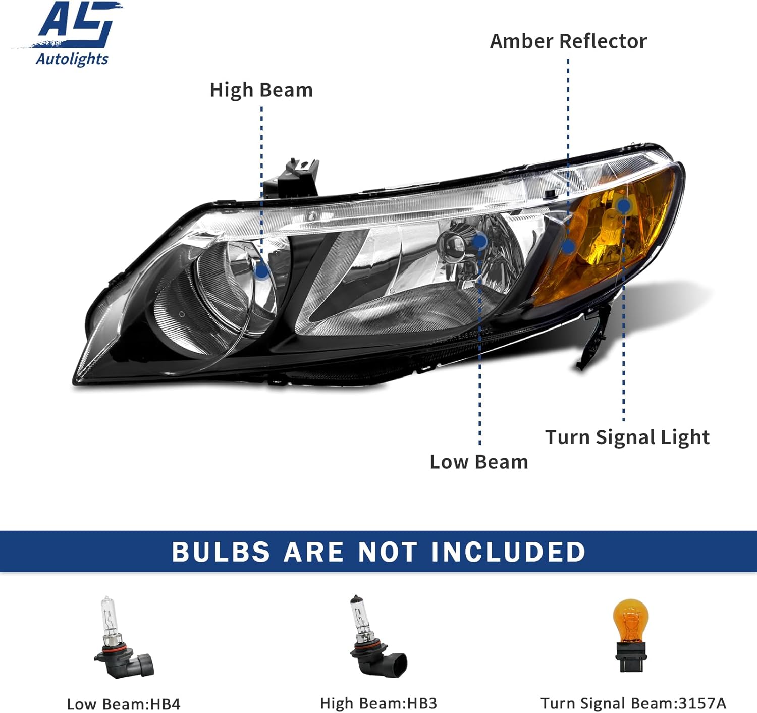 - 【Direct OEM Fitment】Headlight Assembly Replacement for 2006-2011 Honda Civic 4 Door Sedan Headlights.High Beam:HB3; Low Beam: HB4; Turn Signal:3457A(Bulbs not included)