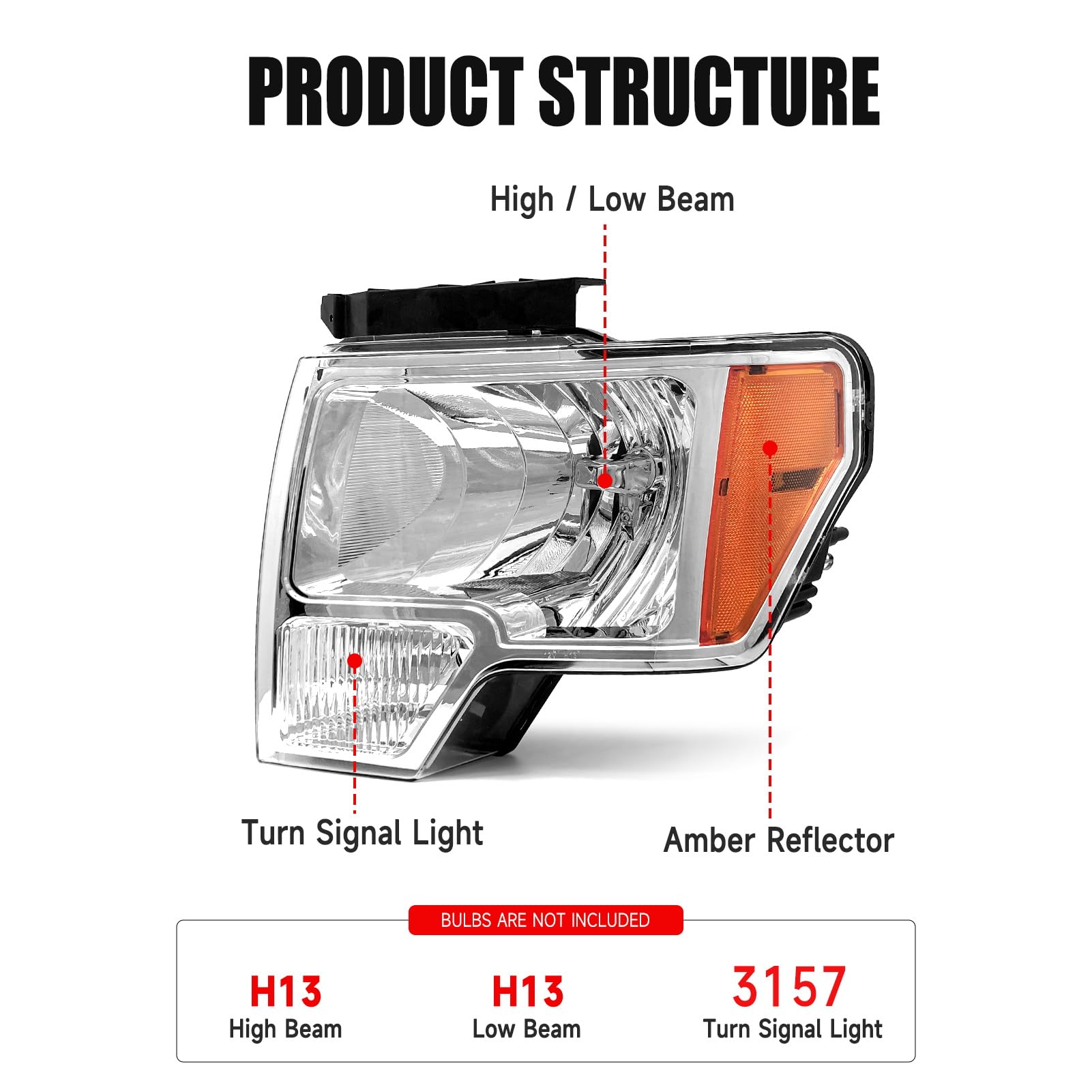 - 【VEHICLE COMPATIBILITY】Headlights assembly compatible with OE Type 2009 2010 2011 2012 2013 2014 Ford F150 Pickup. High/ Low Beam: H13 Bulb, Turn Signal Beam:3157A.No bulbs included