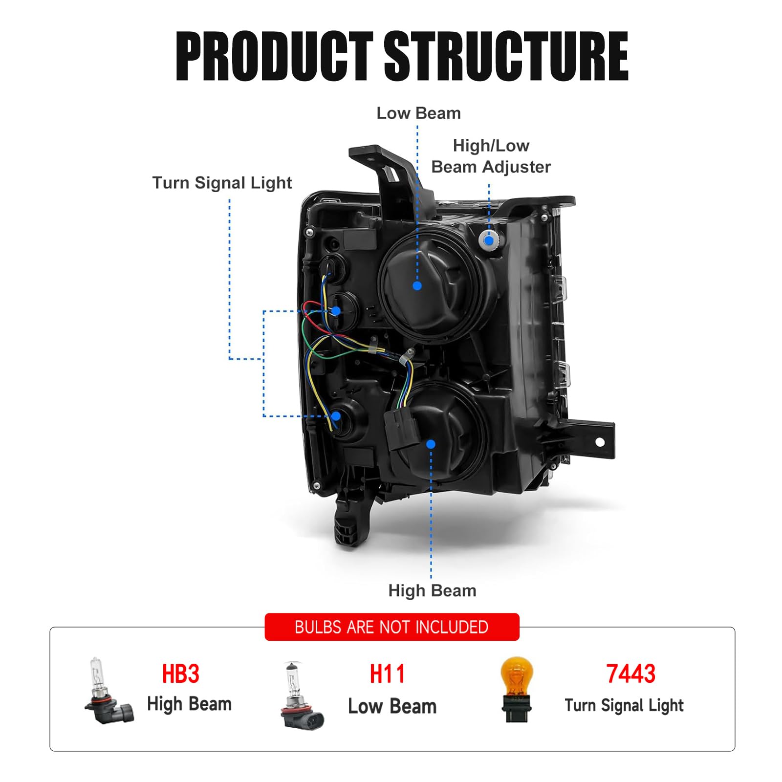 - 【VEHICLE COMPATIBILITY】Headlights assembly compatible with OE Type 2014 2015 Chevy Silverado 1500(Fit 2014 New Body style models only; Does NOT fit HD models).High Beam:HB3 Bulb,Low Beam:H11 Bulb,Turn Signal Beam:7443.No bulbs included.Bulbs are not included