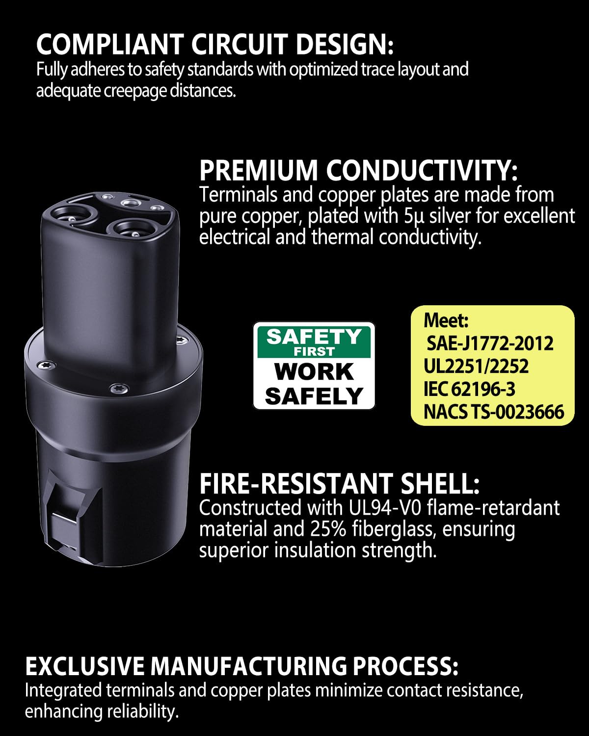 【Durable and Safe Design】:Engineered for longevity, this adapter is tested for over 20,000 plug cycles and can withstand 4,700 pounds of pressure. Built to meet UL and SAE standards, you can trust this adapter for safe and reliable charging wherever you are.