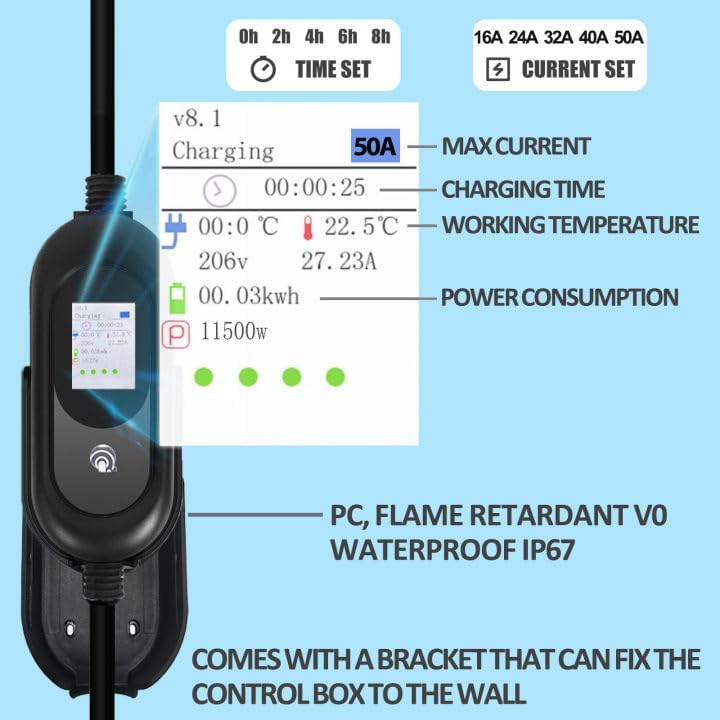 - 【LARGE LCD SCREEN DESIGN】: The LCD screen provides a clear visual representation of the charging status, five-level current selection, and scheduled charging settings. Easily understand the charging process and make adjustments as needed. Comes with a controller bracket and storage bag, making it easy to mount on a wall or use as a portable charger.