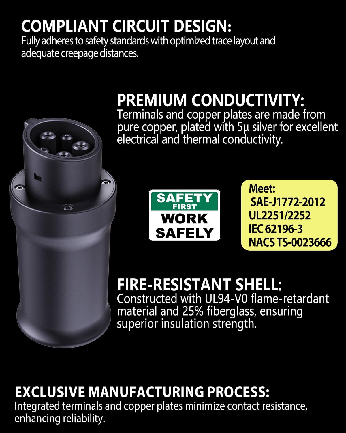 - 【Built for Durability and Safety】:Tested for over 20,000 plug cycles and capable of withstanding up to 4,700 pounds of pressure. This NACS to J1772 adapter meets UL 2251/2252, SAE-J1772-2012, IEC-62196-3, and NACS TS-0023666 standards, ensuring reliable and safe performance wherever your adventures take you.