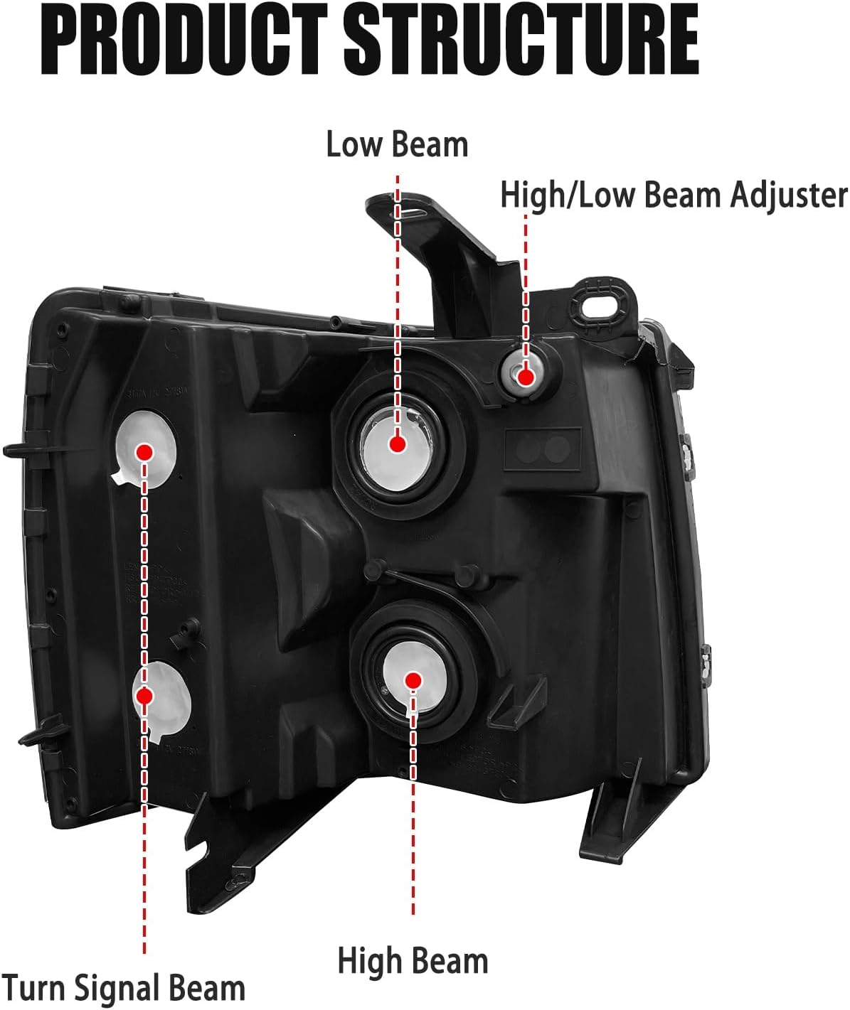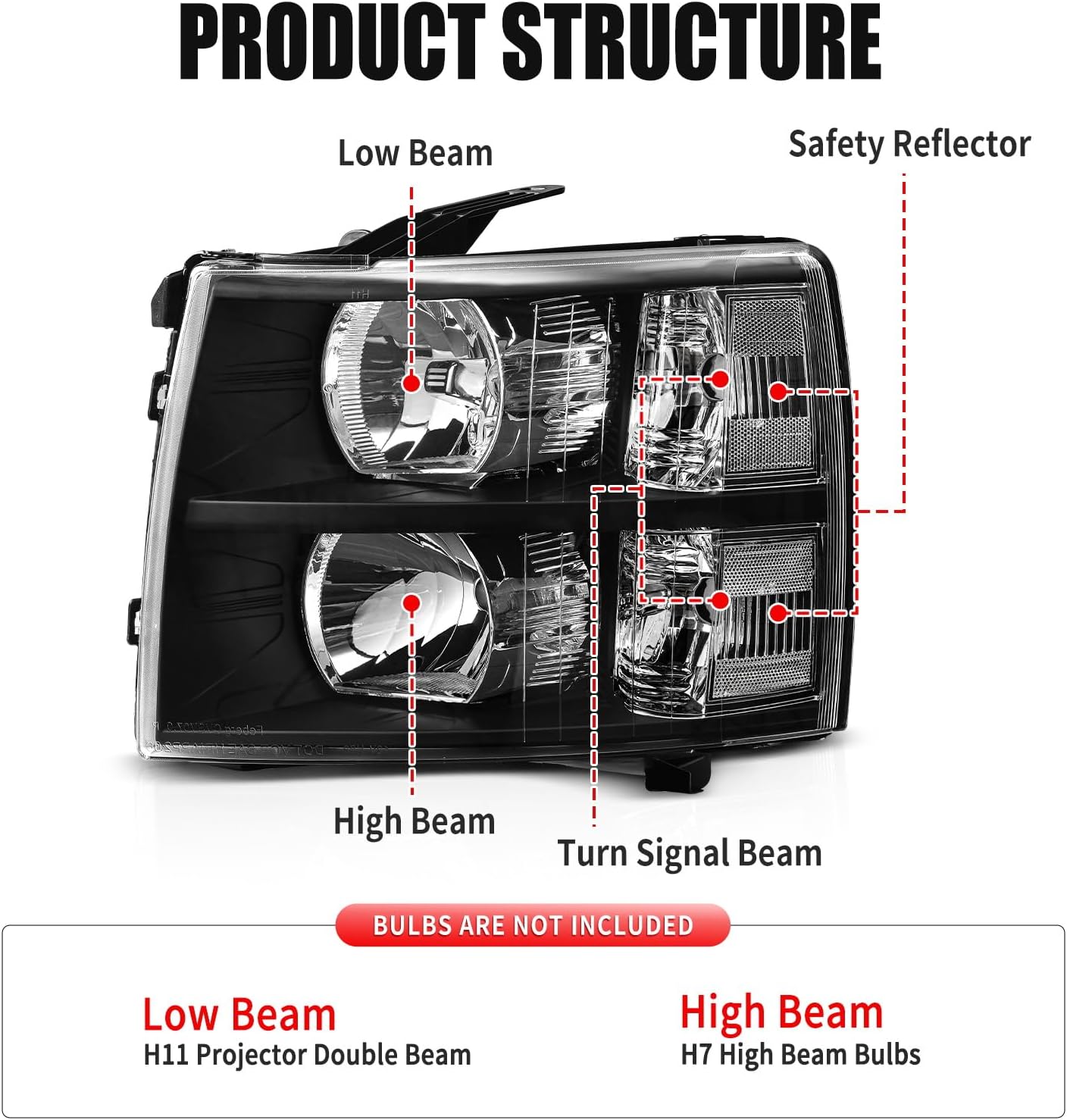 - 【Direct OEM Fitment】Headlight Assembly Replacement for 2007-2013 Chevy Silverado 1500 models only/2007-2014 Chevy Silverado 2500HD/3500HD models only(For 2500HD/3500HD, fit 2007 new body style & 2014 old body style models only).High Beam:HB3 / Low Beam:H11(Bulbs not included)